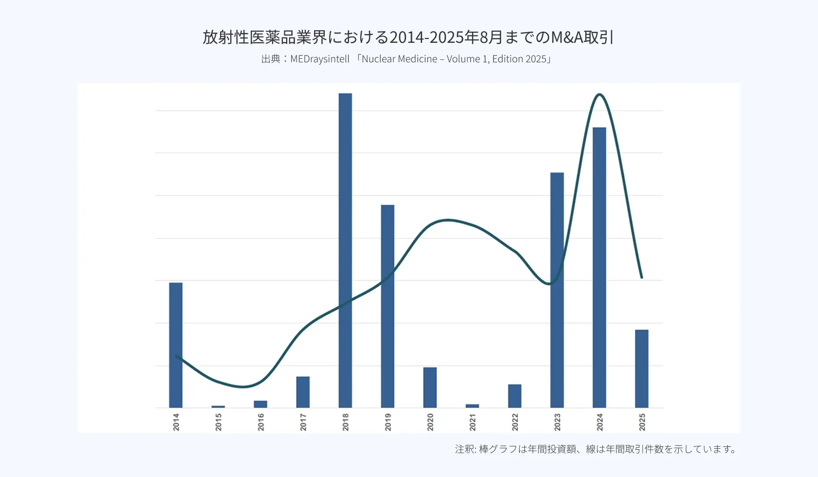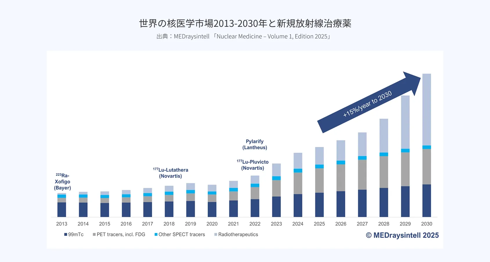MEDraysintell の Nuclear Medicine - Volume I(2025年版)によれば、近年は新たな放射性核種や放射性医薬品が導入され多くの企業が核医学分野の研究開発に積極的に取り組んでいること、放射性医薬品業界における2014~2025年8月までのM&A取引で317億USドルが投資されたことなどから、世界の核医学市場は、2024年から2034年にかけて年率14%の成長率を維持し、2034年までに410億~420億米ドルを超える規模に達すると予想されています。