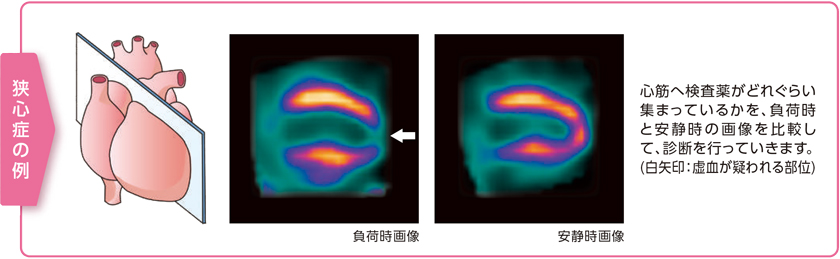 心筋の虚血、壊死の範囲、重症度を確認できます。この他、心臓のポンプとしての働き(心機能)も検査できます。