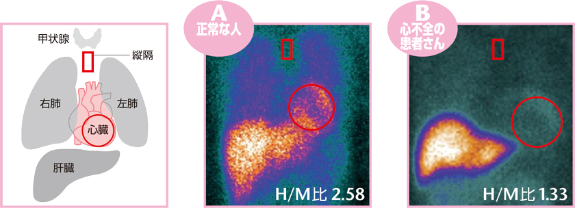 以下は、心臓交感神経機能検査(心シンチグラフィ)で得られた画像で、心臓(赤丸部分)にお薬がどのくらい集まっているかがわかります。Aの正常例では心臓にお薬が集まっています(明るくみえる)が、Bの心不全症例では交感神経の働きが変化してお薬が心臓にとどまりにくくなり、暗い色になります。